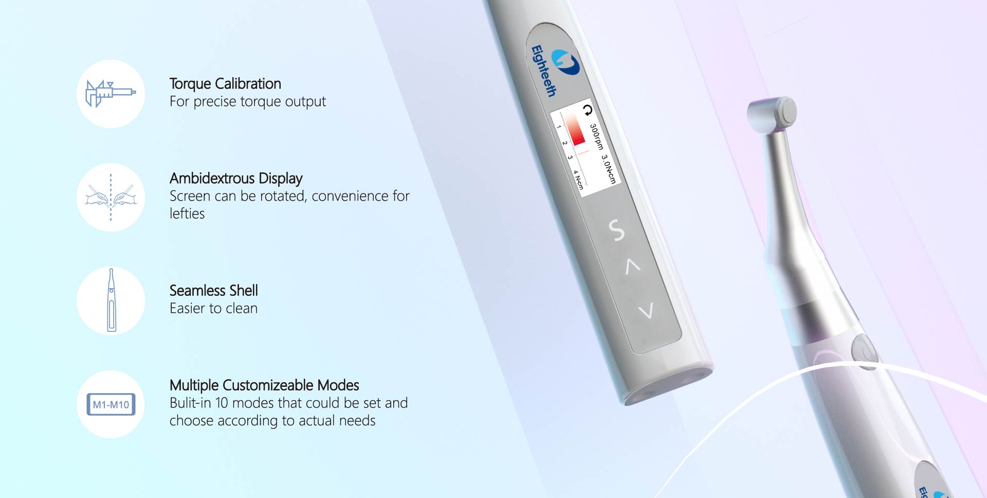 صفحه نمایش قرار گرفته بر روی اE Value نیز از نوع Oled است که میتوان جهت نمایش تنظیمات را متناسب با چپ دست بودن و یا راست دست بودن پزشک تنظیم نمود. بر روی صفحه نمایش میزان شارژ، مد کاری، سرعت و گشتاور تنظیم شده توسط دندانپزشک به نمایش در خواهد آمد.